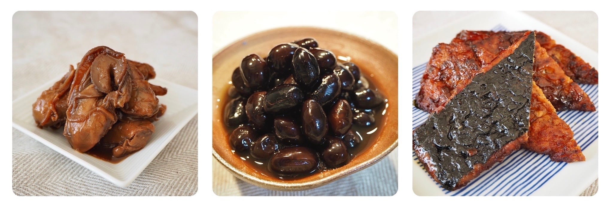 牡蠣の佃煮・昆布巻・金柑の塩煮・餅煮